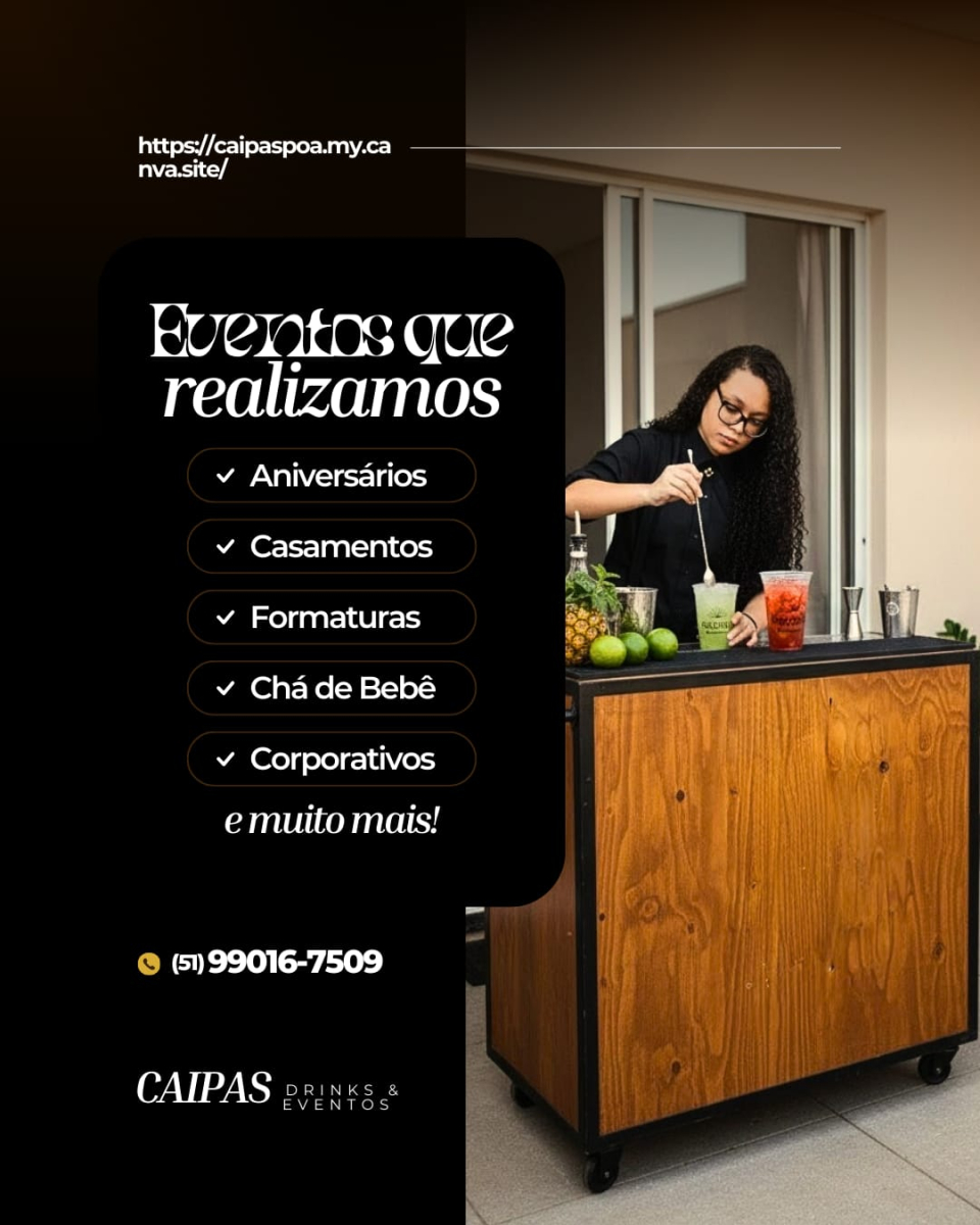 CAIPAS DRINKS & EVENTOS. Se está procurando os melhores bartenders e drinks para o seu evento como casamento, formatura, 15 anos, empresarial, aniversario. Oferecemos a melhor estrutura de open bar para a sua festa ser inesquecíveis. Cardápios personalizados para casamentos, formatura, 15 anos, aniversários e eventos.